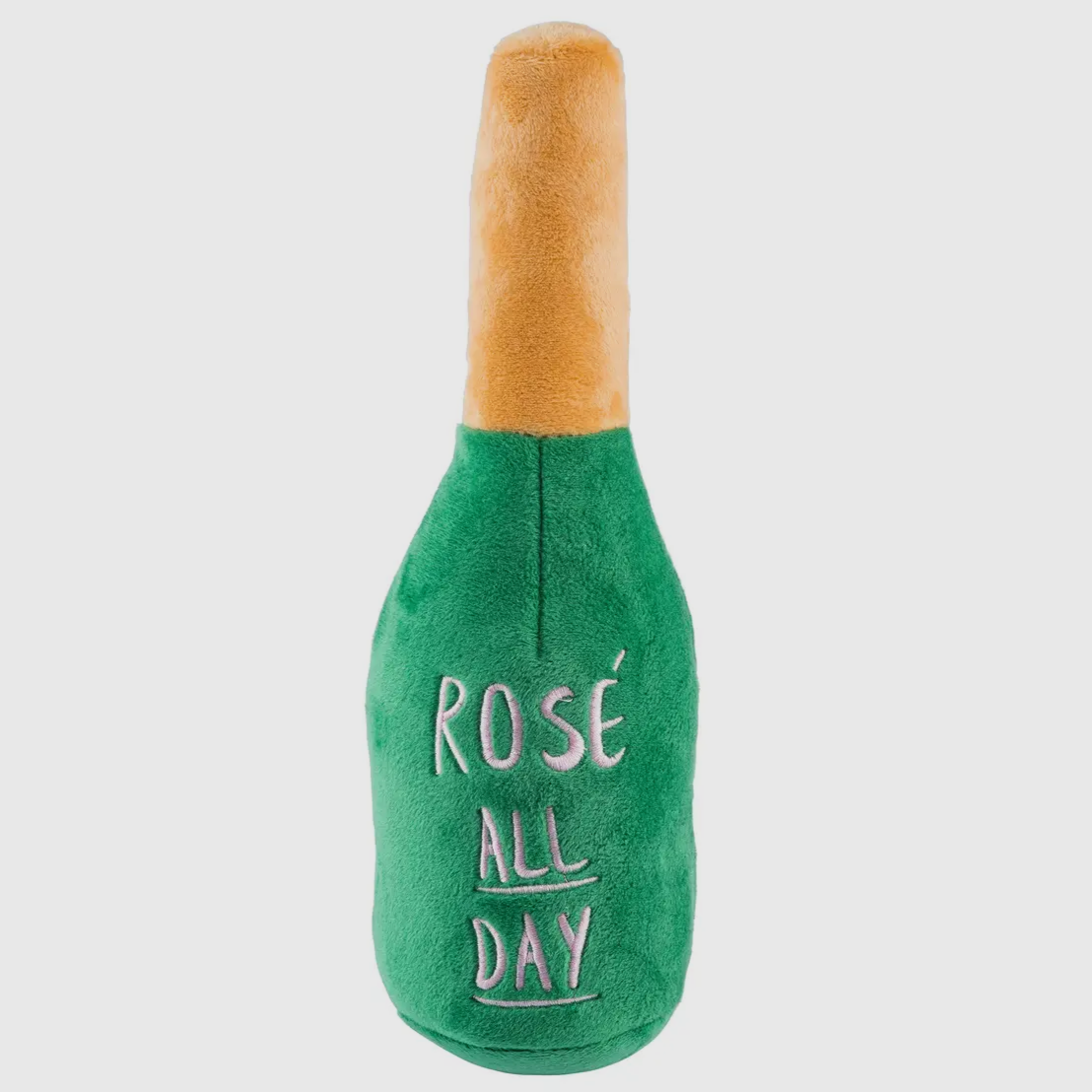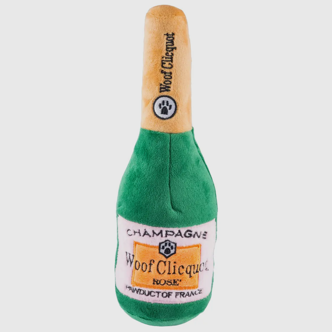 Uncork some fun for your debonair doggy! Our Woof Clicquot Rosé toy is just what your pampered pup needs for the pawfect afternoon playtime. The velvety, plush exterior not only looks and feels pawsitively fabulous, but also hides a fun squeaker inside that will drive your urbane best friend bonkers!